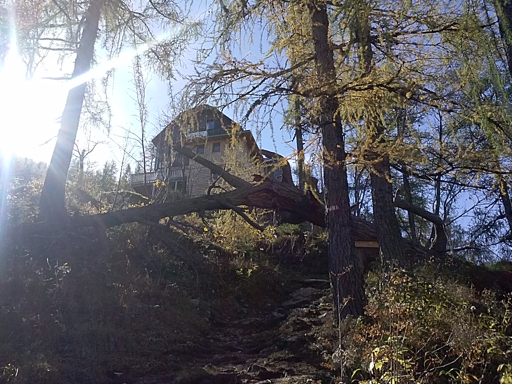 Das erste Etappenziel war die Zellerhütte (1575 Höhenmeter). Von den Schafferteichen weg ist der Weg zur Zellerhütte angeschrieben. Auf einer Nebenstraße führt der Weg hinter einem Haus direkt in den Mischwald, der gerade im Herbst wunderschön bunt ist. Stetig bergauf durch den Wald kommt man zu einer Schotterstraße die wir überquerten. Von da an beginnt die Materialseilbahn der Zellerhütte. Der Weg führt uns eine zeitlang unterhalb der Materialseilbahn bergauf durch den Wald. Nach 2 Stunden haben wir die Zellerhütte erreicht.