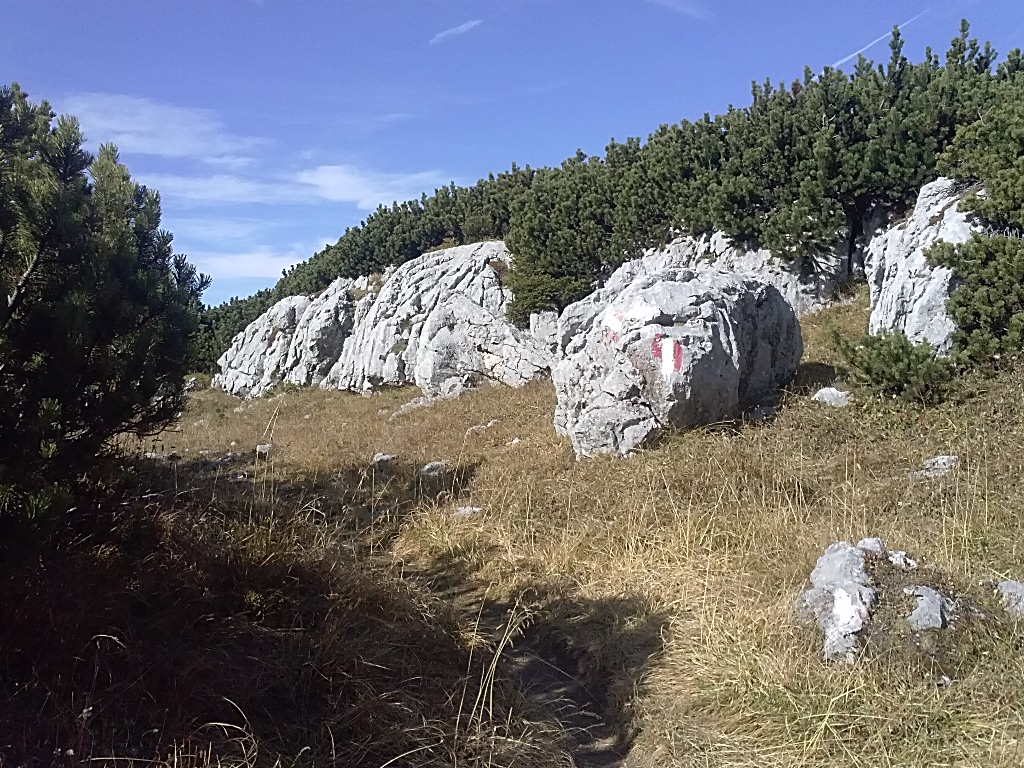 Nach einer kurzen Rast auf der Zellerhütte ging es weiter bergauf durch den Wald. Der Wald wechselt dann nahtlos in halbsteiniges Gelände mit Latschen. Es lässt sich mittlerweile erahnen was für ein großartiger Ausblick auf uns warten wird. Der Weg zieht sich zäh sehr weit und tief, bergauf in den Berg hinein. Ich fand es mental anstrengender als physisch. Bei jeder Anhöhe die Hoffnung den Gipfel endlich zu sehen um trotzdem wieder enttäuscht zu werden, dass es sich nur um einen weiteren kargen, steinigen Anstieg handelt.