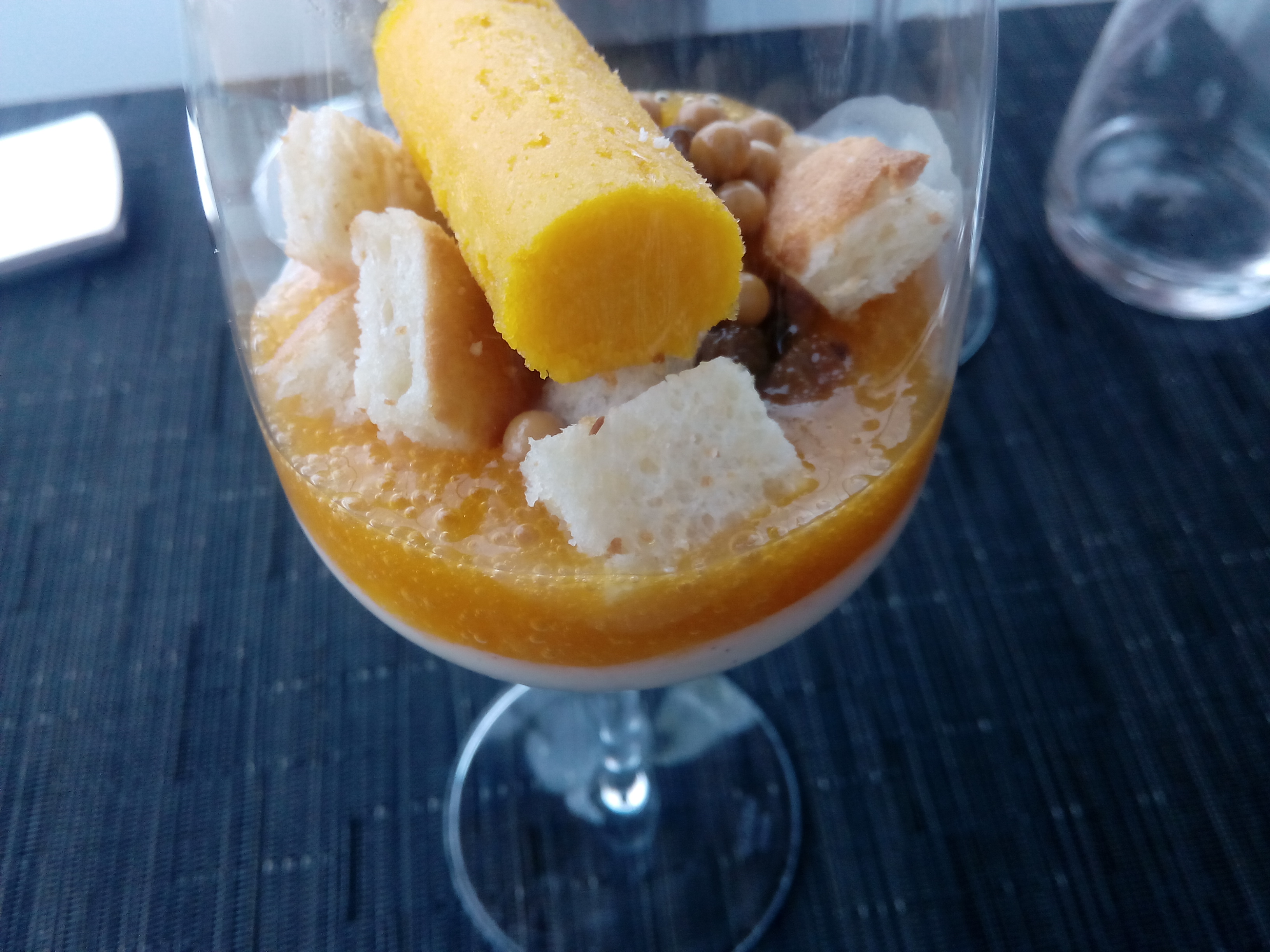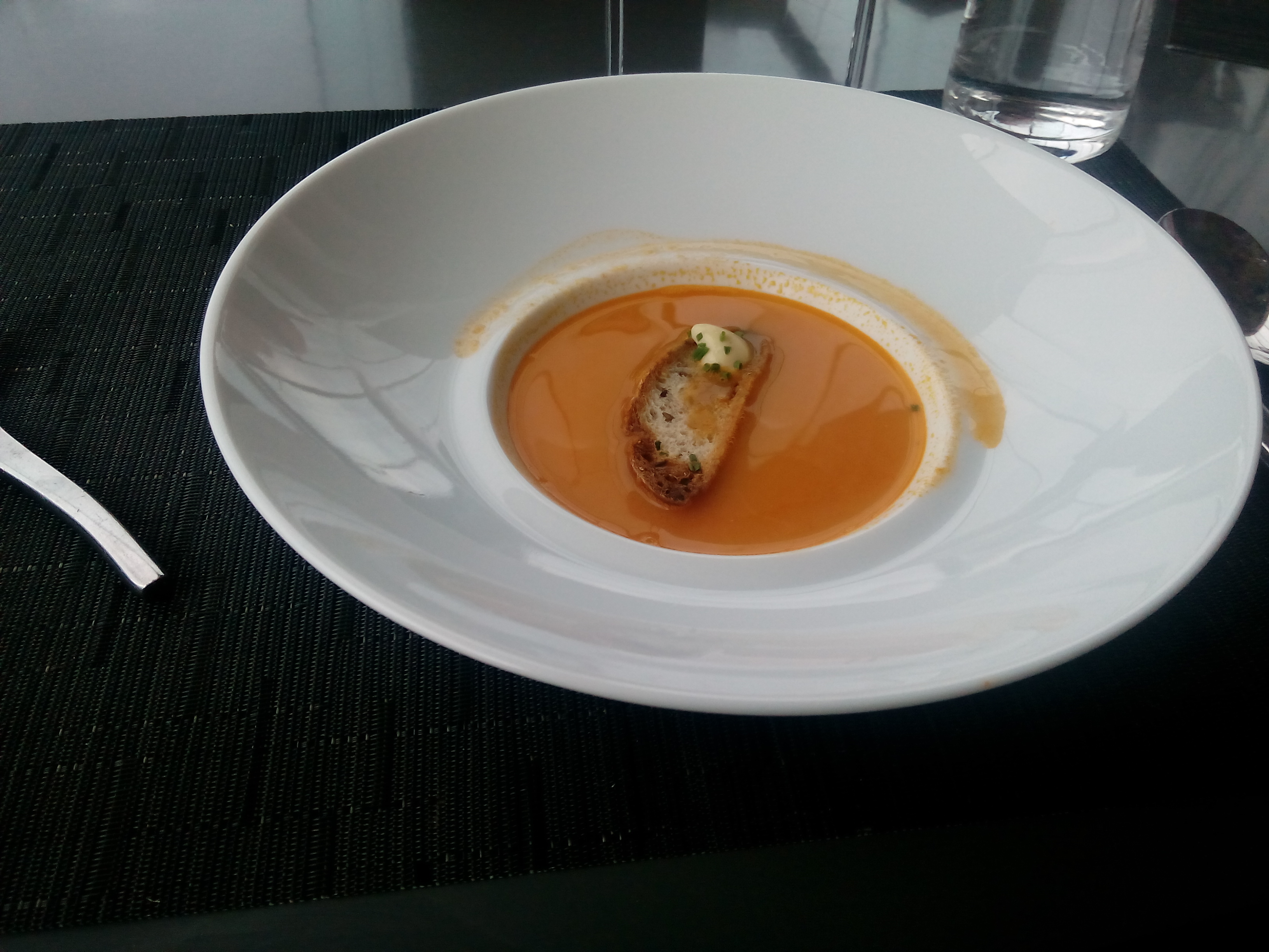 Das Lunchmenü bestand aus 3-Gängen mit Weinbegleitung. Ich war schon sehr gespannt auf die Küche. Als Vorspeise wurde mir eine Meeresfrüchtesuppe gereicht mit geröstetem Brot. Dazu wurde mir ein Welchriesling aus der Wachau gereicht und natürlich Wasser.
