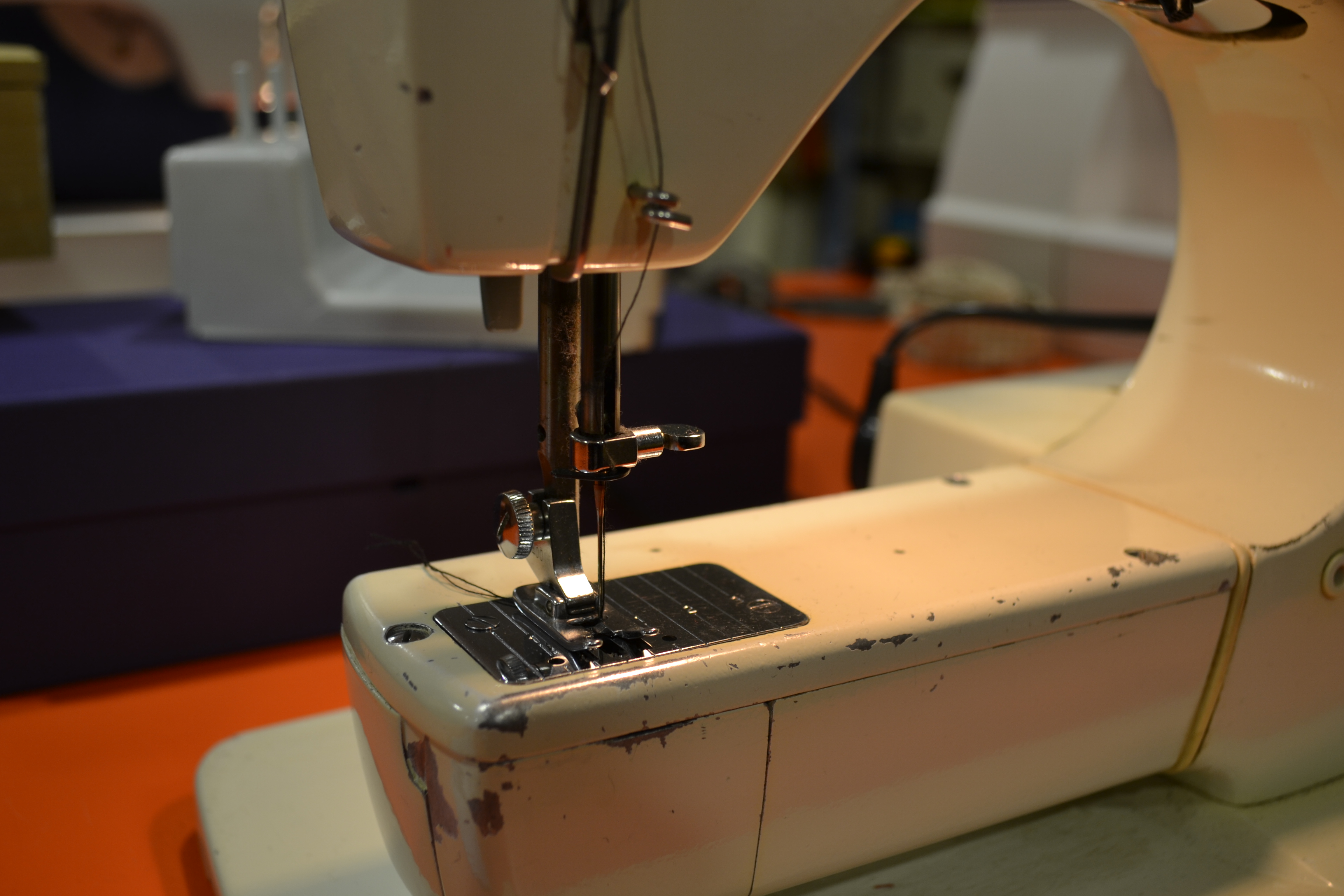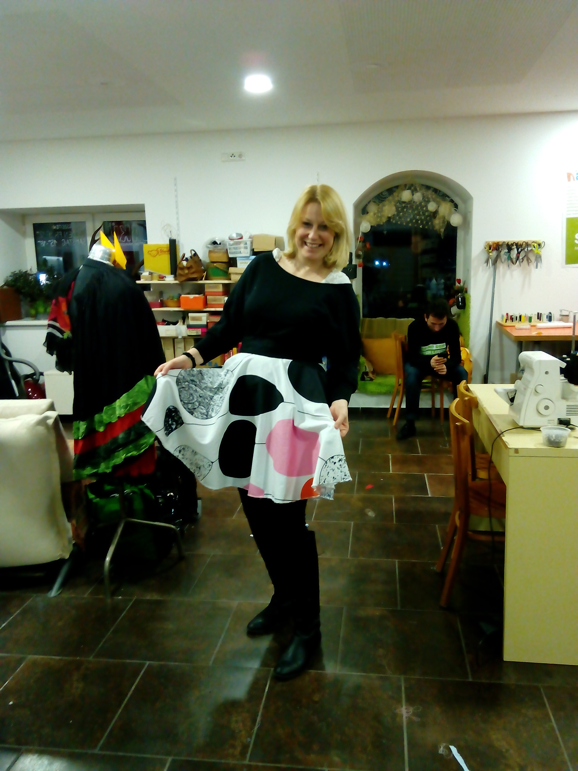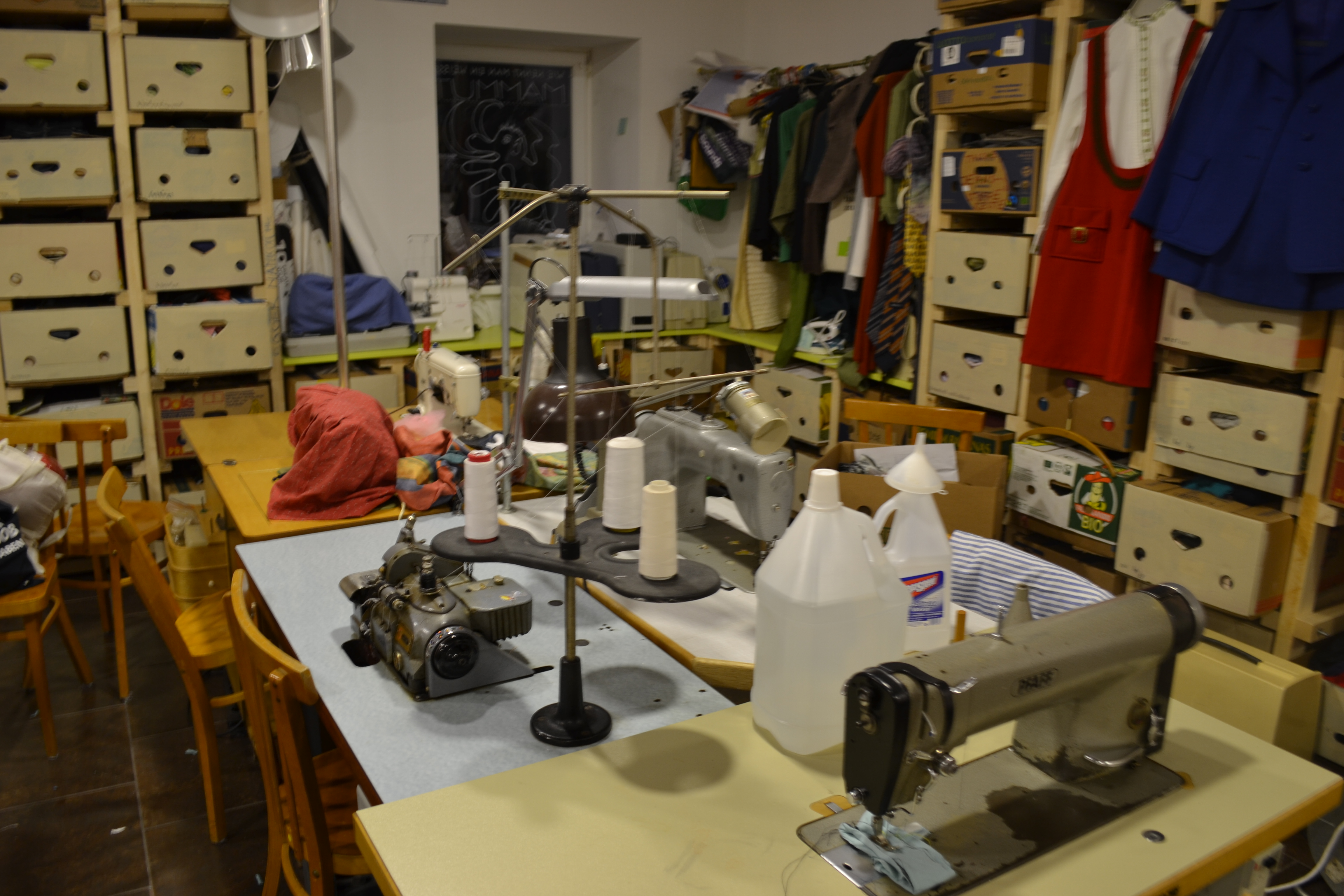 Sozusagen eine offene Näh-Werkstatt mit Materialien, Garn, Nähmaschinen und Menschen die einem in seinem vorhaben unterstützen bzw weiterhelfen können. Die Nähküche hat am Freitagvormittag und am Samstagnachmittag offen. Ich bin rein und mir hat sofort eine Dame geholfen. Lustigerweise ist sie Handarbeitslehrerin in einer Schule und betreut die Nähküche in ihrer Freizeit. Ich habe ihr ein Foto gezeigt wie ich mir den Rock für mein Kostüm vorstelle und sie hatte sofort eine Idee wie wir das Umsetzen. Meinen Vorhangstoff hätte ich nicht unbedingt mitnehmen brauchen, weil die Nähküche Kistenweise an Stoffen bzw alten ausgedienten aber guten Kleidern besitzt die wieder eine neue Verwendung finden können. Auch Borten, Verschlüsse, Knöpfe alles ist da und alles zur freien Entnahme. Die Nähmaschinen alt, aber gut gewartet. Sogar eine Over-Look steht hier zur Verfügung. Das ist scheinbar DIE Nähmaschine unter den Nähmaschinen, weil die näht ganz tolle Abschlüsse. Hab ich selbst ausprobieren dürfen, da ich den kompletten Saum meines neuen Rockes alleine genäht habe. Naja Meistern war ich noch keine, meine erste Naht weist viele Fehler auf, aber es hält und ich bin mega stolz darauf, dass ich das erste Mal eine Nähmaschine in meinen Leben betrieben habe.