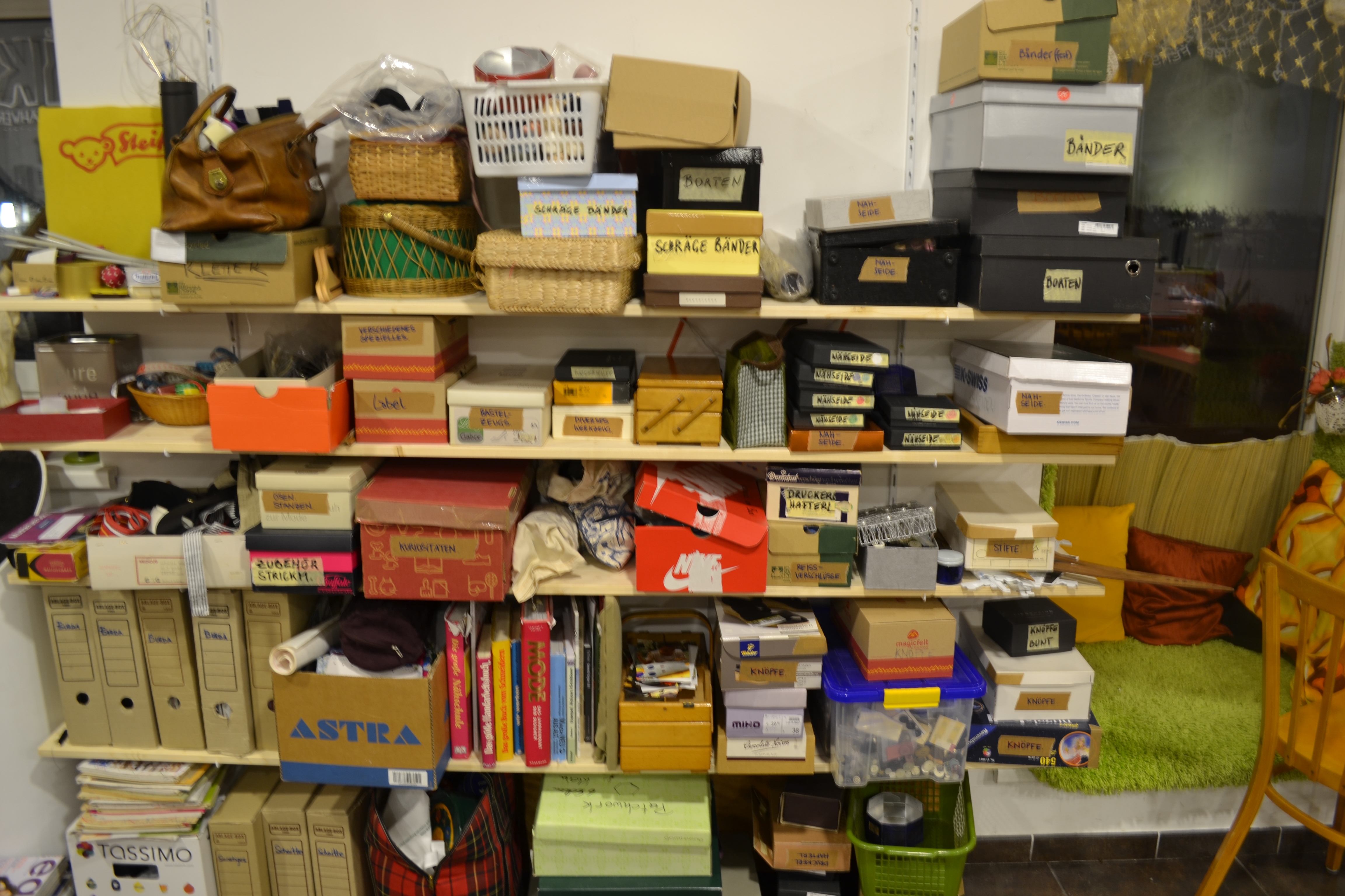 Hier befindet sich eine gigantische Sammlung an Borten, Knöpfen, Verschlüssen verschiedenster Art zum freien „Entnähen“. ;-)