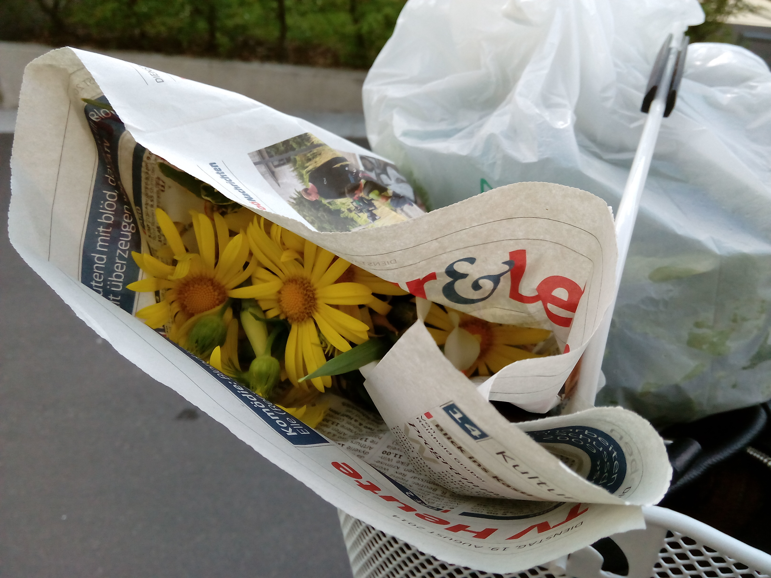 Bildcredits: DorisWorld – Mein Einkauf vom Grünmarkt – Schön wird alles Heim transportiert im Fahrradkorb