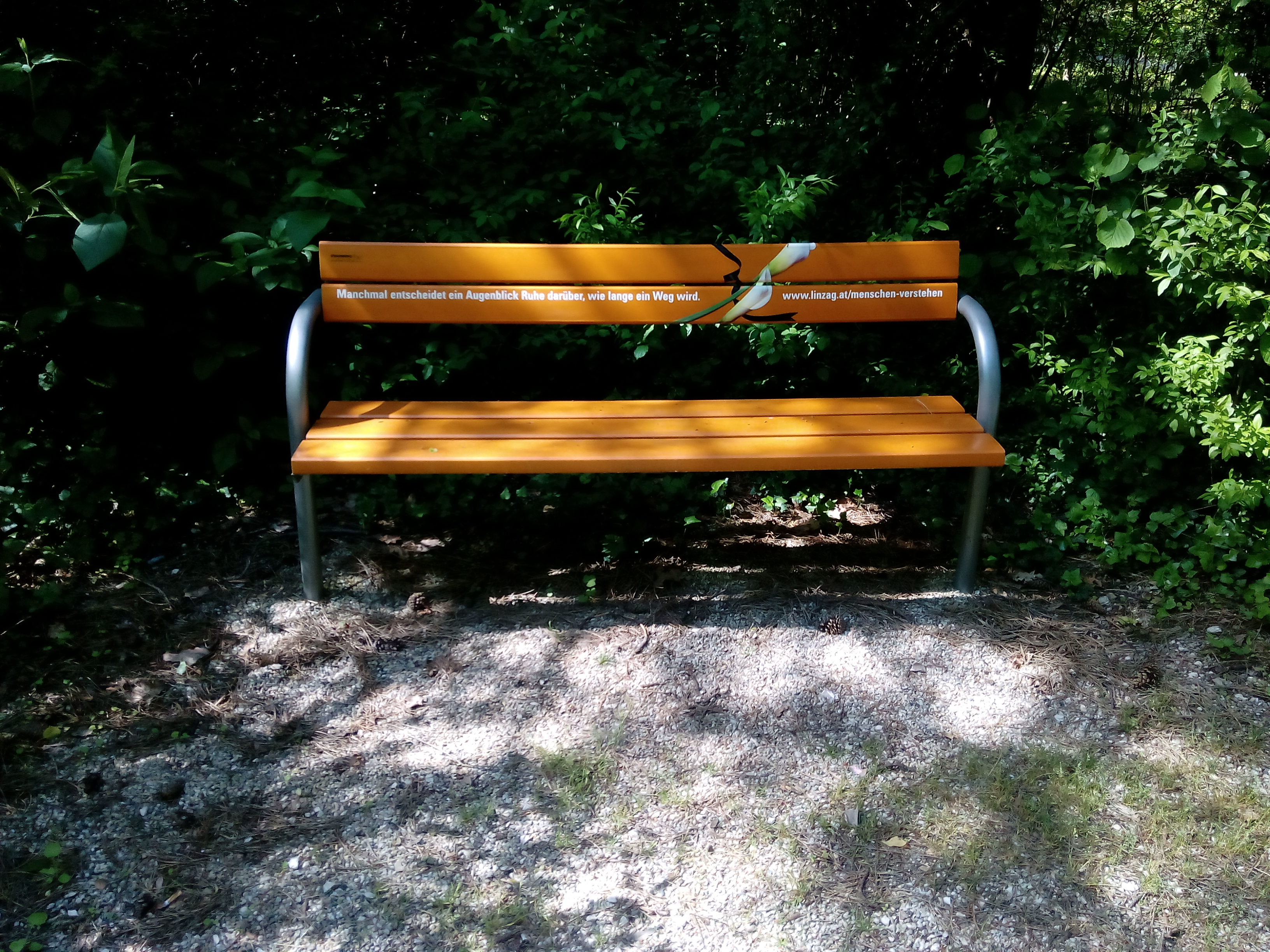 An meiner ersten Arbeitsstelle, da war ich 17, die furchtbar war das kann ich euch versichern, habe ich meine Mittagspausen zum Kraft schöpfen oftmals dort in der Parkanlage verbracht. Auf einer Bank habe ich dann meine Jause gegessen, dabei die Bäume, Sträucher, die Natur beobachtet, die Ruhe war herrlich. Oftmals habe ich mir damals gewunschen, dass neben mir auf der Bank jemand gesessen wäre, der diese Zeit mit mir teilen hätten können. Geteiltes Leid ist oftmals halbes Leid. Ein Jahr lange habe ich mir fast jeden Tag und jede Mittagspause diese Ruhe gegönnt, somit konnte ich dort sehr viele Wege kennenlernen. Denn wer schon mal dort war, weiß der Wald mit seinen Wegen die fast alle gleich ausschauen können ziemlich verwirrend sein.