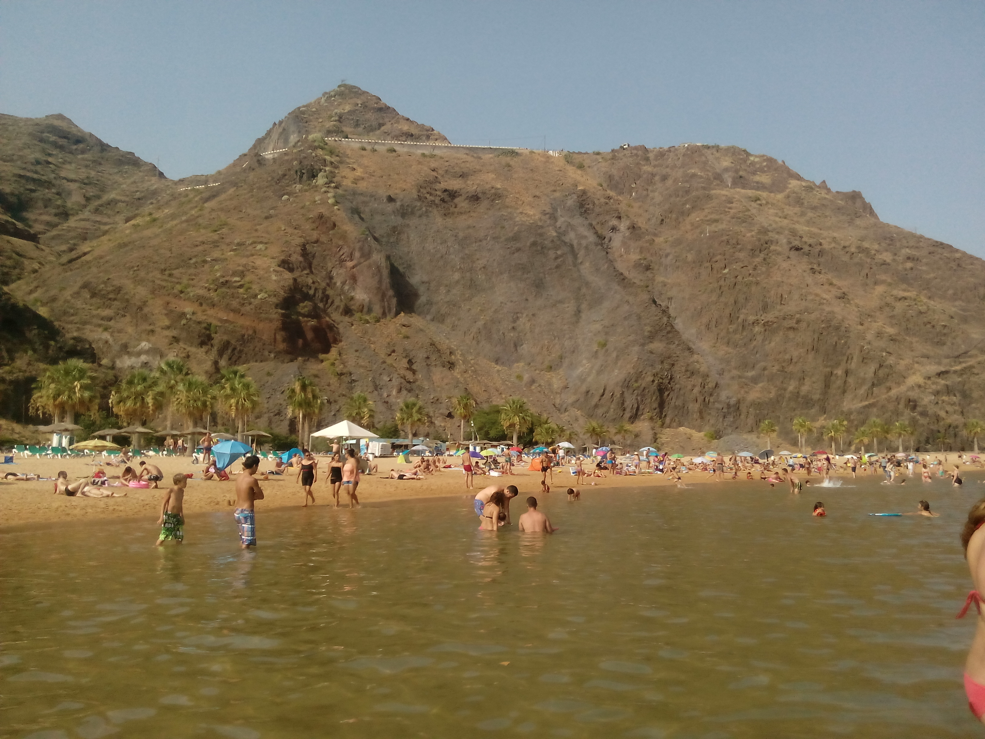 Teneriffa ist eine Vulkaninsel. Demnach ist das Gestein der Sand dunkel. Wie man eh auf den Bildern erkennen kann. Allerdings war es irgend einem (reichen) Menschen ein Anliegen einen sogenannten weißen Sandstrand auch auf der Insel zu haben. So haben sie in San Andrès das ist knapp neben Santa Cruz de Teneriffa (der Hauptstadt von Teneriffa) und vor dem Anaga Gebirge Sahara-Sand von Afrika rüber gbracht und den Sahara-Sand dort in San Andrès aufgeschüttet. Das Ergebnis ein Beach wie man es in Italien kennt – sehr familientauglich. Durch eine Steinmauer die die Wellen abhält, hat das ganze etwas Badewannenartiges. Bunte Farben, sonnenhungrige Menschen, Sand zwischen den Zehen – dieser Strand schreit nach Sommer.