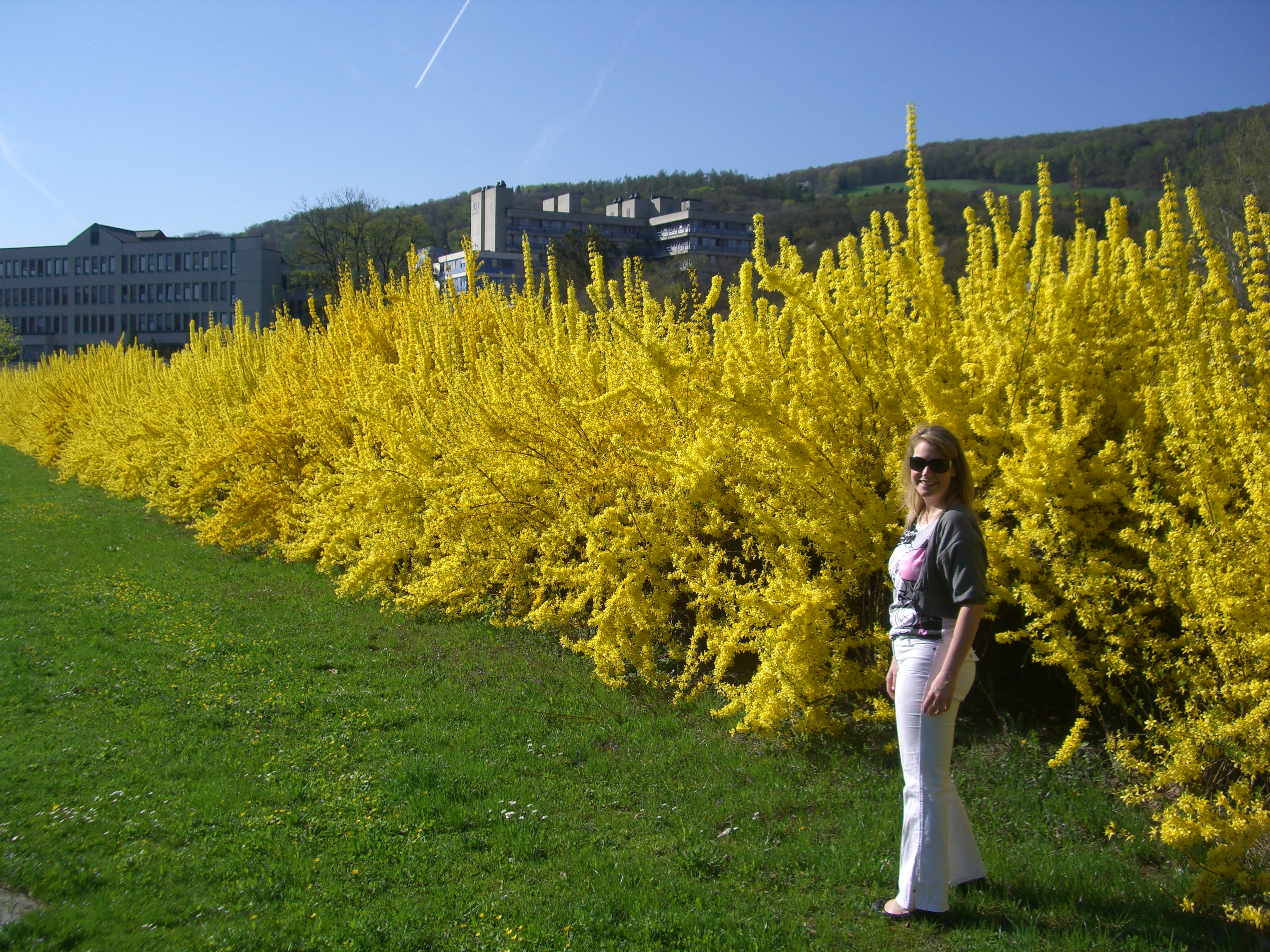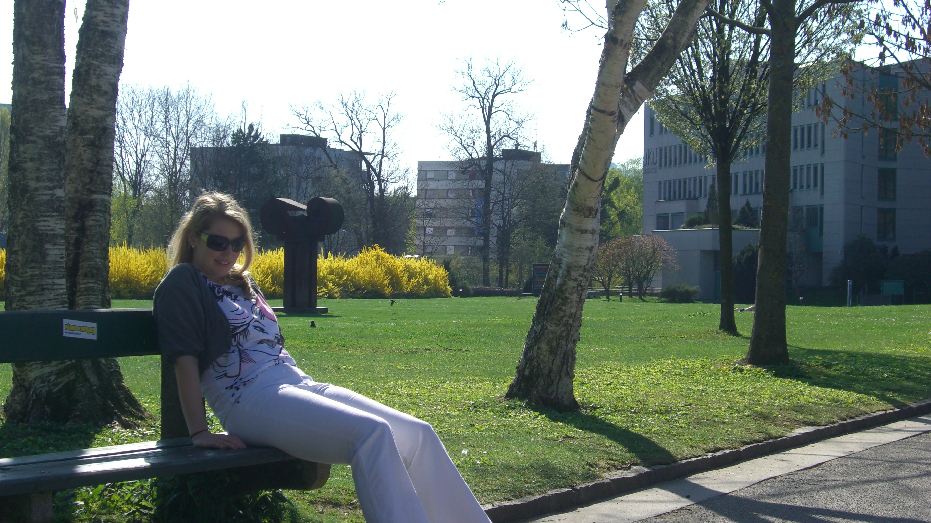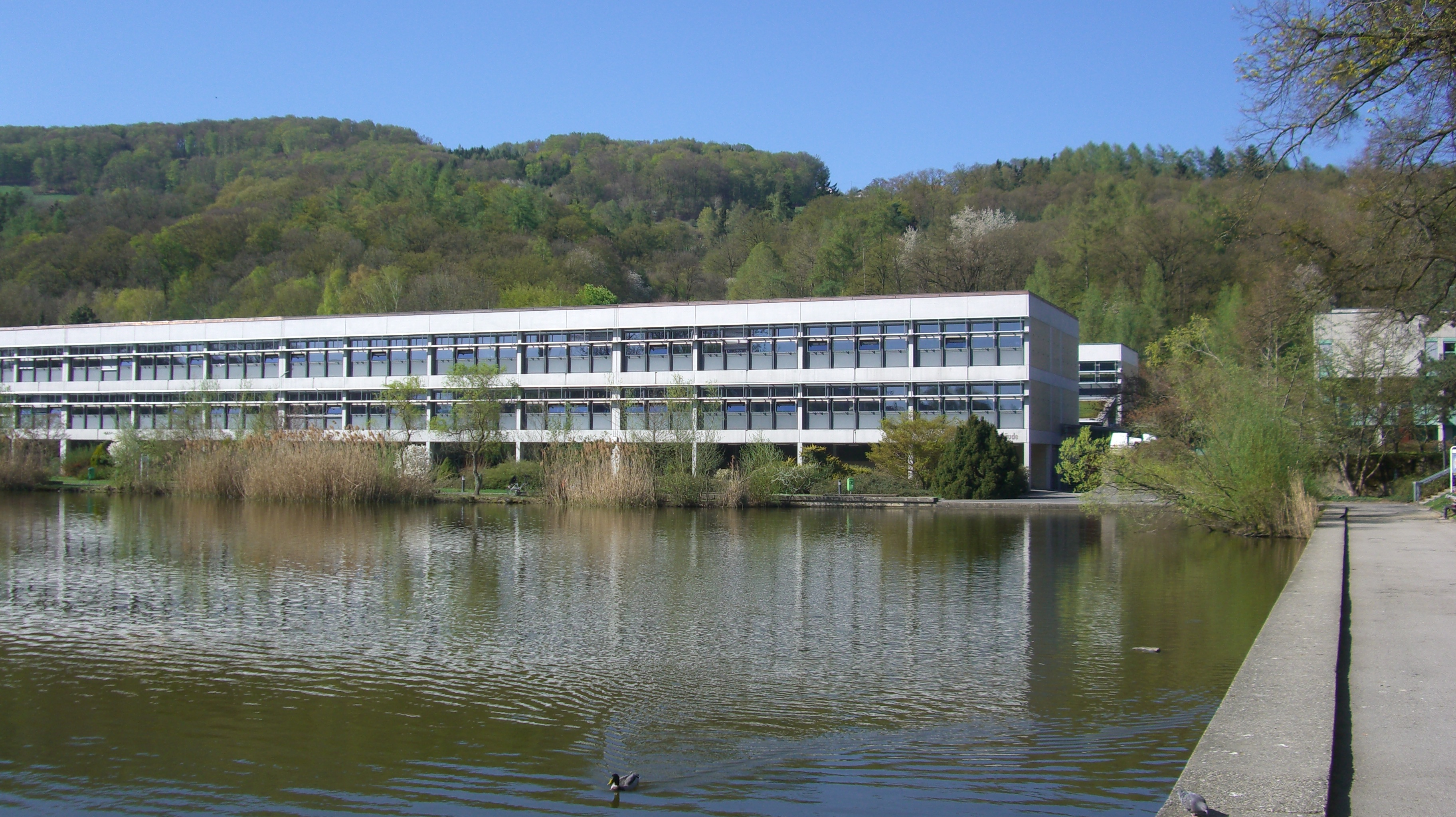 Vorne bei der Universität selbst der besagte Teich mit den Entchen drauf. Daneben die Gebäude der Universität verstreut am Campus angeordnet. Am Semesteranfang und –ende wusselt es nur so von Studierenden. In den Sommermonaten überwiegen die Pensionisten die Entchen fütternd an den Parkbänken rund um den Teich sitzen.