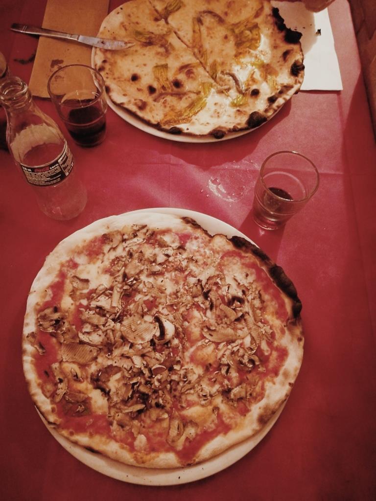 Abendessen ging es dann nach Monti, ins Grazie a Dio è Venerdi, wo Flavia bereits einen Tisch reserviert hat. Ein einfaches, aber köstliches Pizza-Lokal. Dünner Teig, wenig Belag, so mag ich meine Pizza am liebsten. Ich habe mir eine Funghi bestellt und Flavia hat eine Pizza mit Zucchini-Blüten und Sardellen gegessen. Zucchini Blüten mit Sardellen, Käse die Kombination kannte ich noch nicht, ist angeblich etwas typisches aus Rom, sie hat aber vorzüglich geschmeckt.