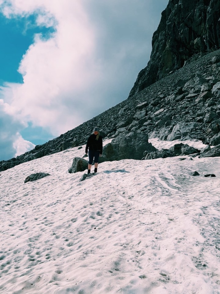 Schon bald sind wir über der Scharte mitten im Steinernen Meer gestanden, mit einer atemberaubenden Sicht auf den Dießenbach-Stausee. Der Weg führte über einige Schneefelder und ab und an sind Helikopter über uns geflogen. Schon bald war das Ingolstädter-Schutzhaus von der Ferne sichtbar.