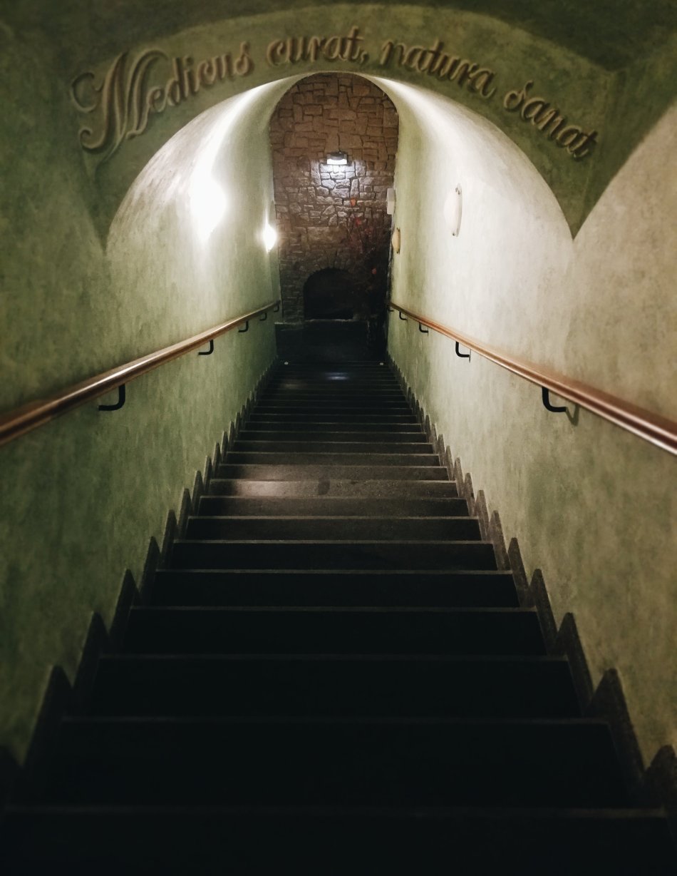 Der Wellnessbereich, also genauer genommen der Indoor-Pool befindet sich im Erdgeschoss. Im Keller dann die Behandlungsräume, das Böhmerwald Kräuterbad und die Naturhöhle. Die Behandlungstermine habe ich mit meinen Behandlungs-Pass bei der Rezeption beim Einchecken bekommen. Eine Behandlung am Samstag Vormittag und das böhmische Kräuterbad am Sonntag in der Früh. Durch den Hoteldirektor erfahre ich: Der Keller wurde vor ein paar Jahren komplett neu umgebaut, die Idee war es etwas Besonderes zu schaffen, nämlich eine Oase für einen Kuraufenthalt mit einer einzigartige Verbindung zwischen Bad in der Natur, Erdenergie und Geschichte.
