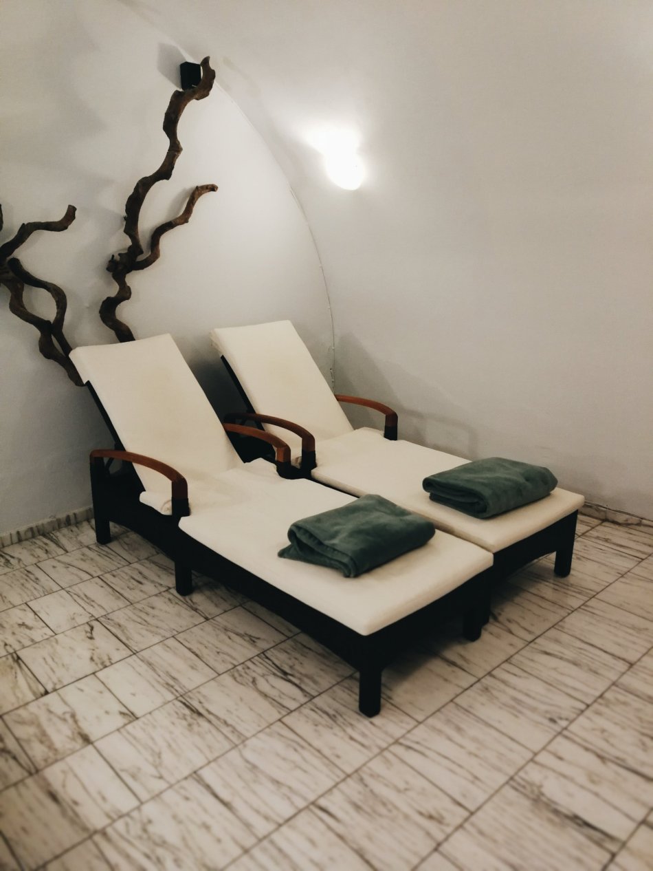 An der Rezeption habe ich meine Zimmerkarte erhalten und einen Pass mit den „Behandlungen“. Einmal Massage und einmal Kräuterbad. Bei der Zimmerbuchung sind nämlich die Behandlungen als Package inkludiert. Die Hotelhalle mit der erhöhten Galerie mit den Kaminöfen, Schachtischen und den vielen Uhren die in einer angenehmen Art und Weise auf die Vergänglichkeit der Zeit aufmerksam machen verleihen dem Hotel eine spezielle Atmosphäre.