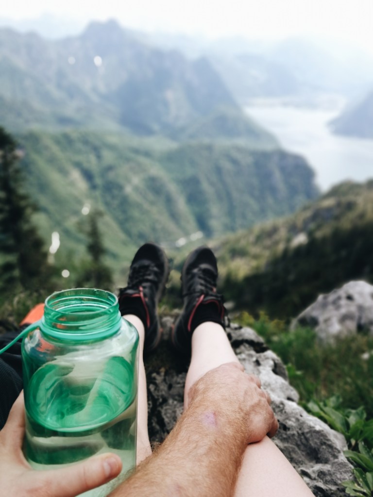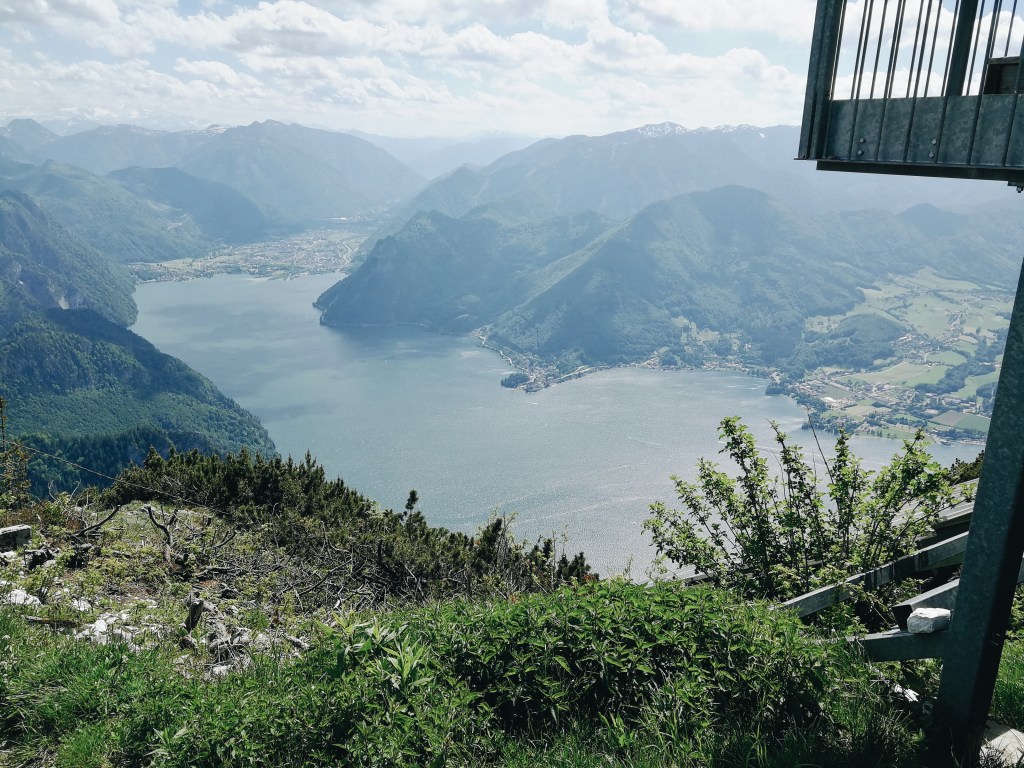 Wir hatten viel Wasser, Nüsse und ein paar Kracker mit. Ich musste immer wieder kleine Verschnaufpausen einlegen, weil es war sehr heiß war und auch die atemberaubende Aussicht auf den Traunsee und die umliegenden Berge musste genossen werden.