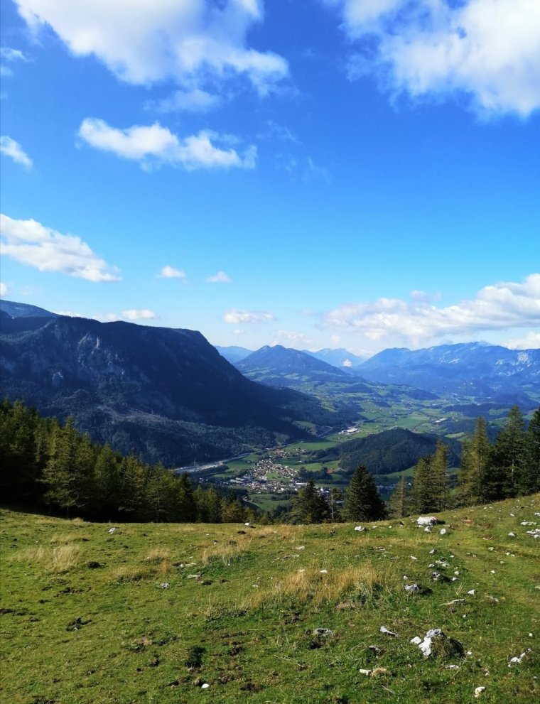 Beim Rohrauerhaus gehts dann weiter zur HOFALM. Auf der Hofalm lässt sich fast das ganze Alpenvorland bis nach Linz überblicken. Wunderschön. Auch die Hofalm ist bewirtschaftet, also wer was Essen oder Trinken will, sollte das unbedingt, wenn das Wetter passt, auf der tollen Terasse draußen tun.